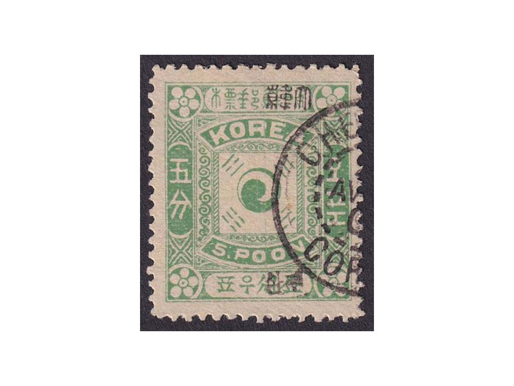 Poštovní známka, Korea, 1897, 5 P s přetiskem, MiNr.7Ib, razítkované