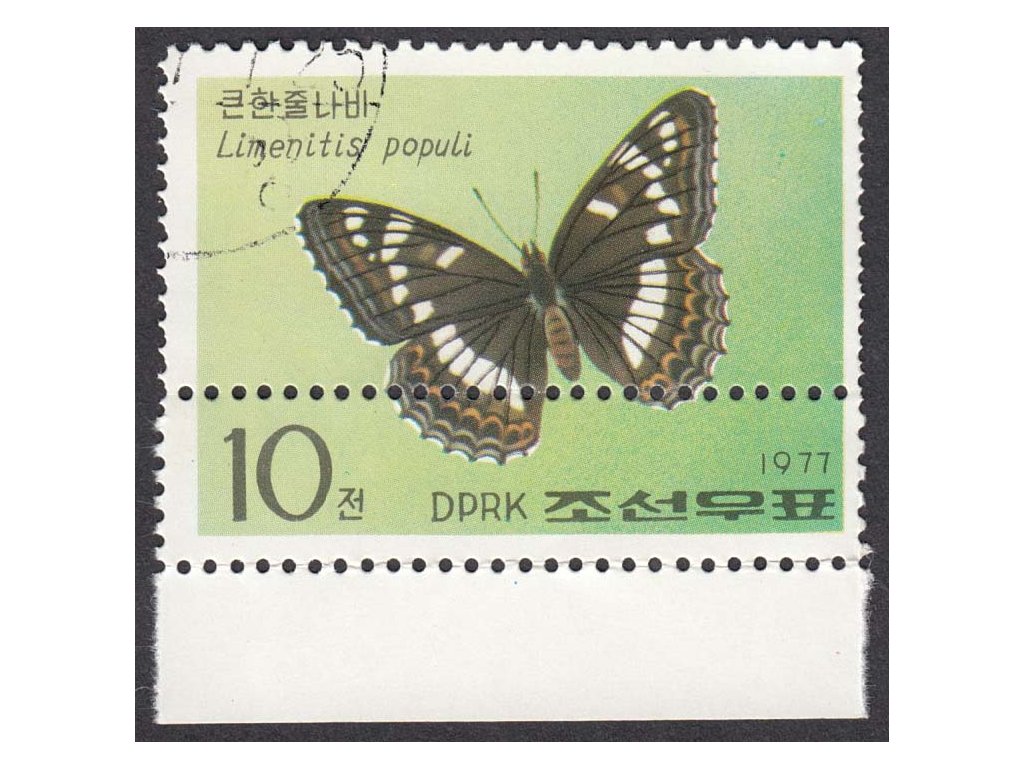Poštovní známka, Korea-Nord, 1977, 10 Ch Motýl, posun perforace, MiNr.1655, razítkované