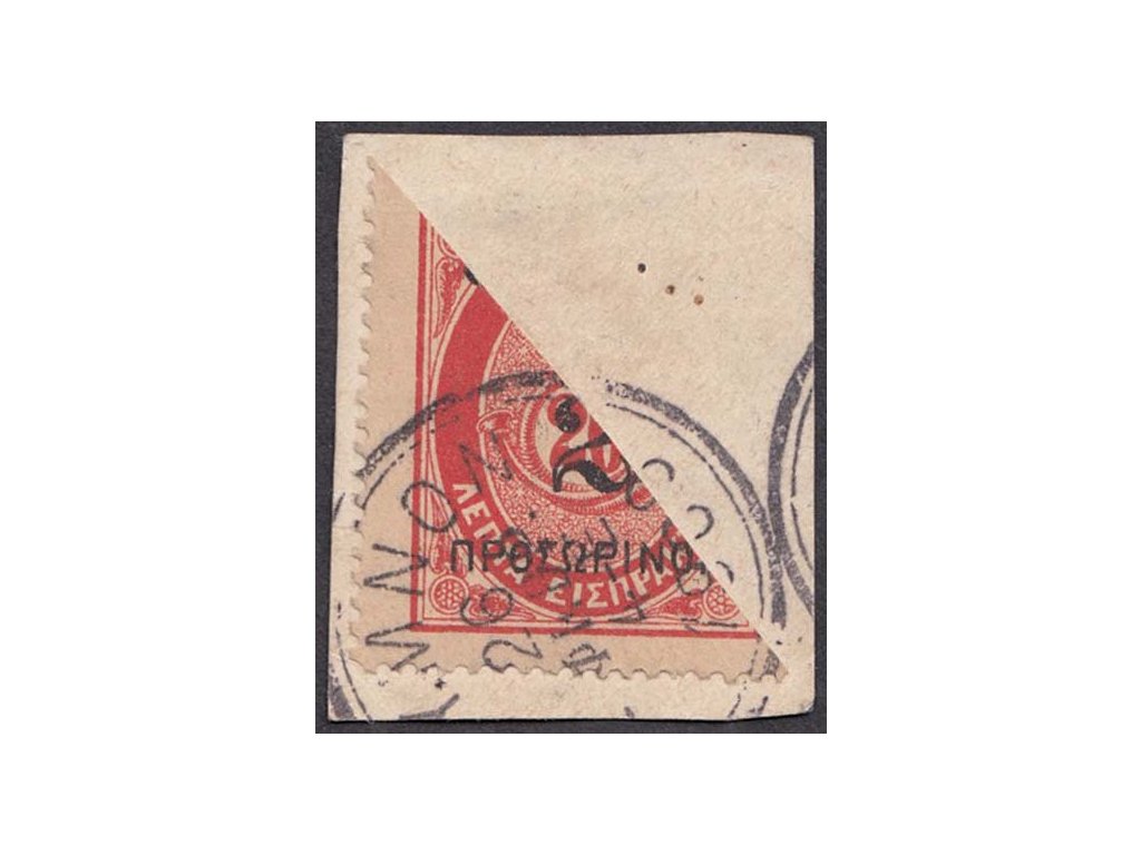 Poštovní známka, Kréta, 1909, 2L/20L doplatní, půlená frankatura, MiNr.45, výstřižek