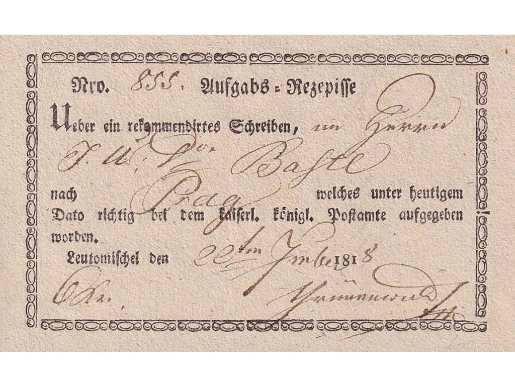 Podací lístek, Leutomischl, recepis z roku 1818, krásný kus, lehce přeloženo