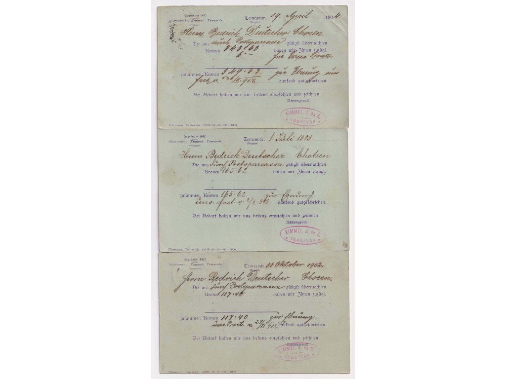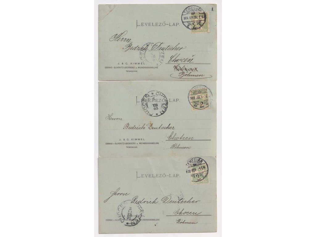 Maďarsko, 1902, 3 ks firemních karet vyfr. zn. 5 f Turul (perfin), DR Temesvár, zasl. v letech 1902-4 do Čech, různá jakost - viz. foto, zajímavé