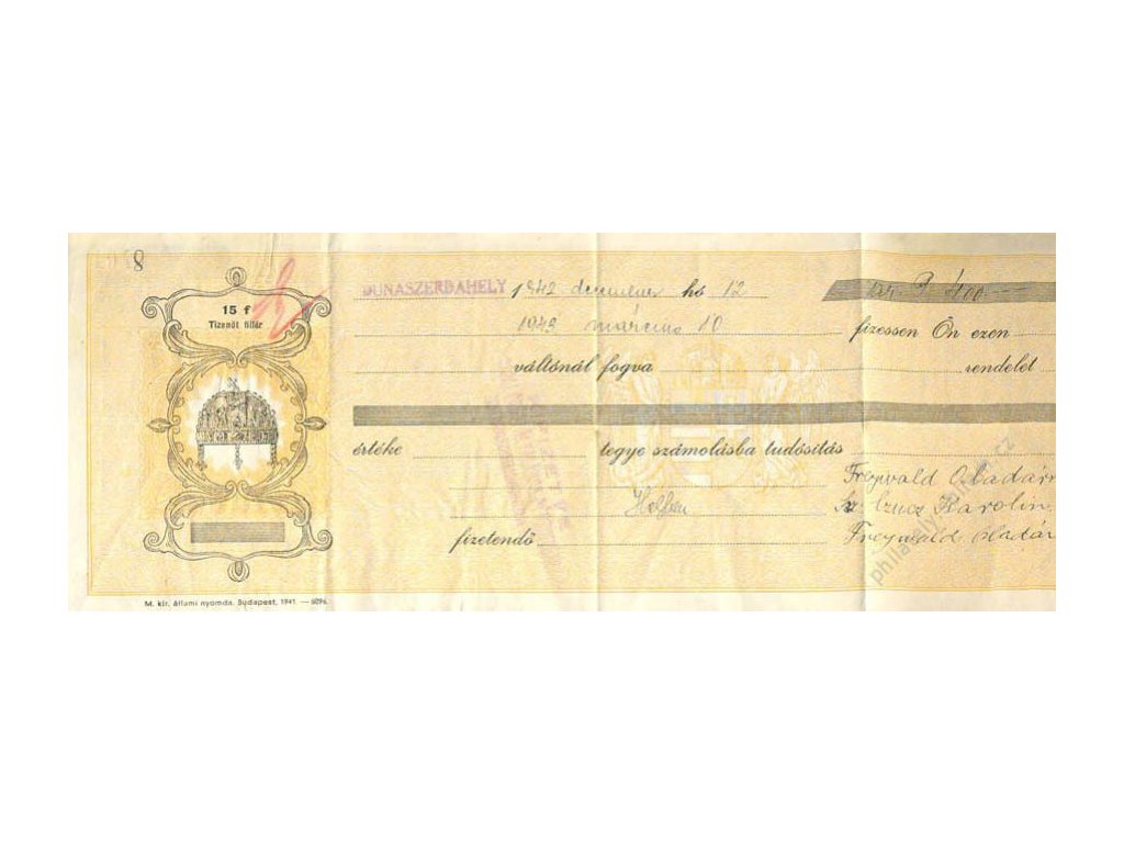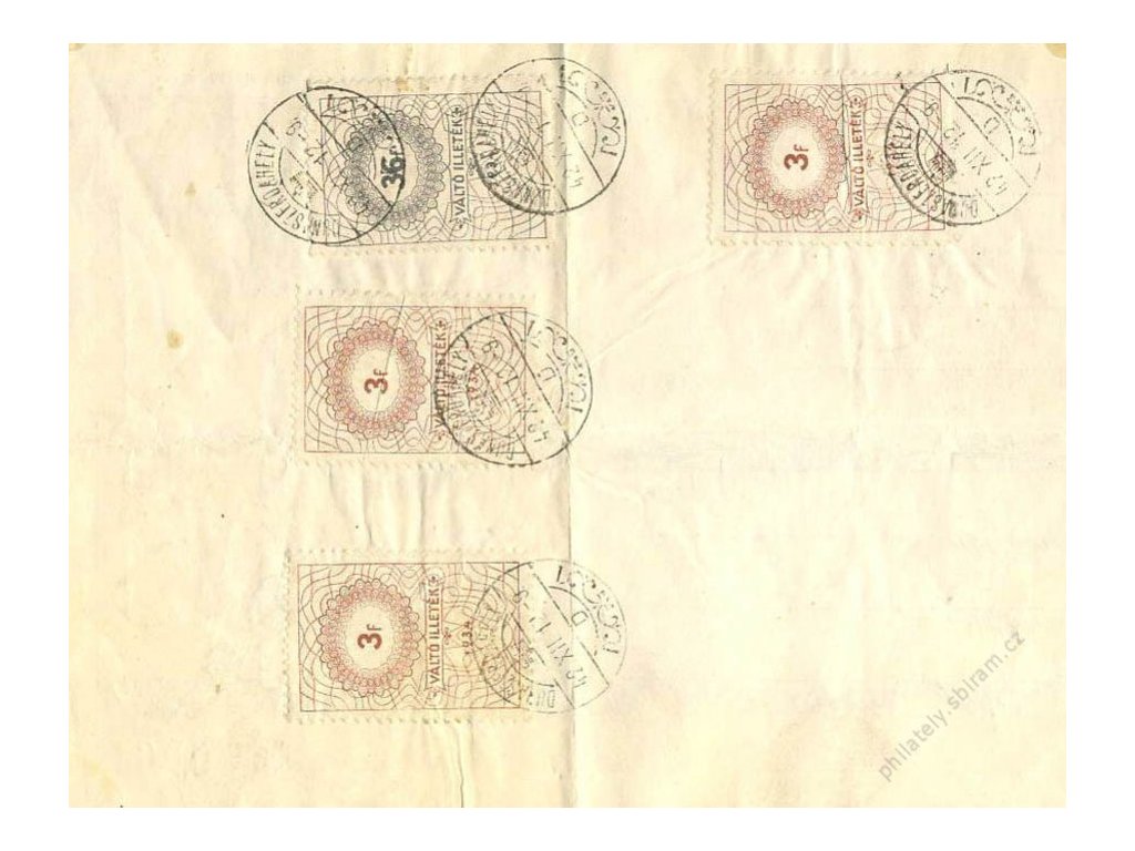 Maďarsko, 1942, směnka s kolky 3+3+3+36f, DR Dunaszeroahely, několikrát přeloženo, stopy stáří, horší jakost