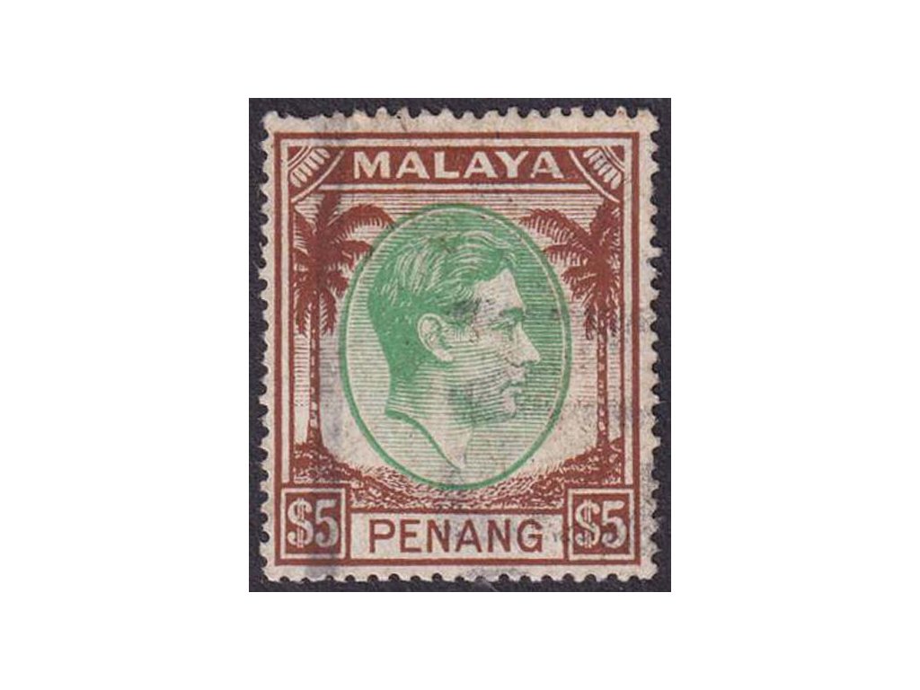 Poštovní známka, Malay, Penang, 1949, 5 Dolarů Jiří VI., MiNr.22, razítkované