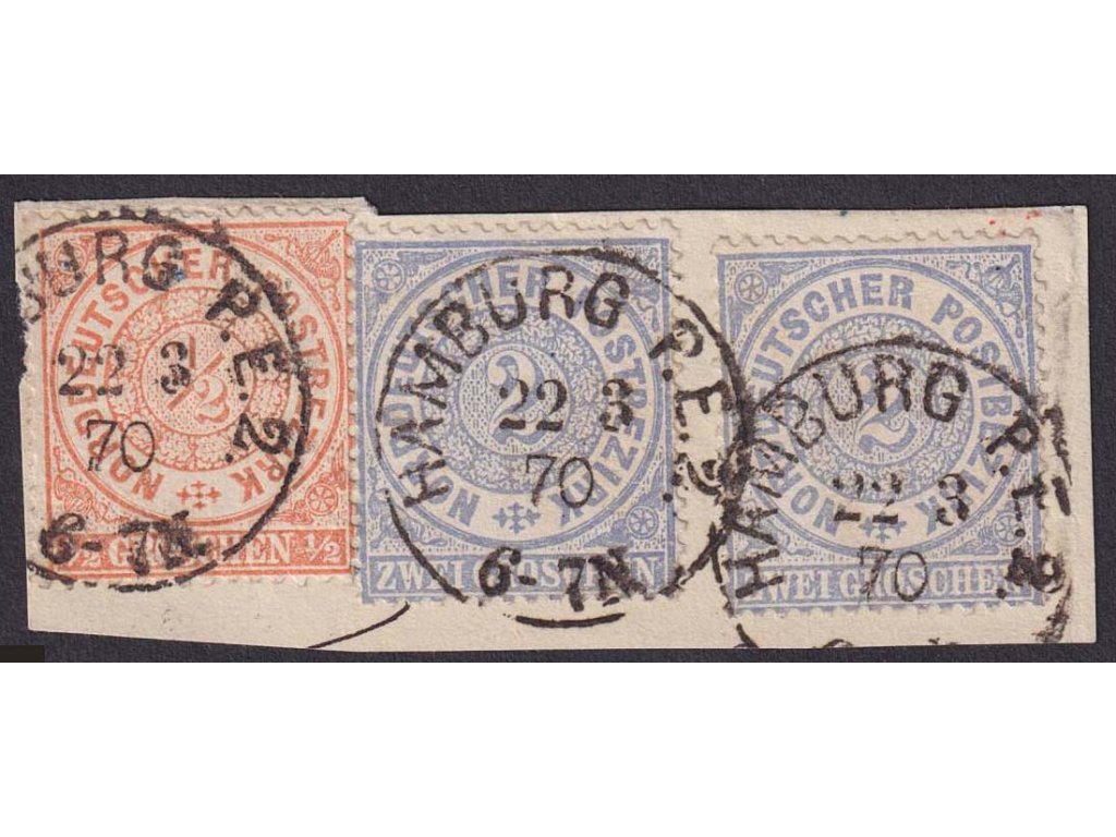 Poštovní známka, Norddt. Postbezirk, 1870, výstřižek, MiNr.15,17, razítko Hamburg