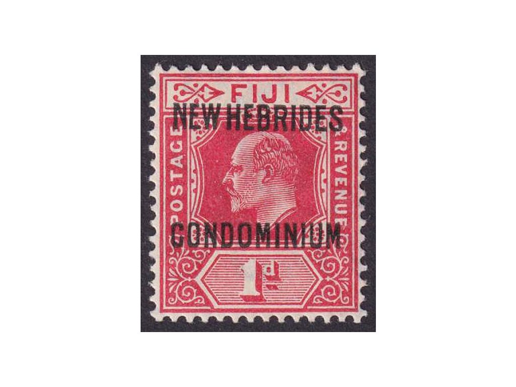Poštovní známka, Nové Hebridy, 1908, 1 P Eduard, MiNr.8, * po nálepce