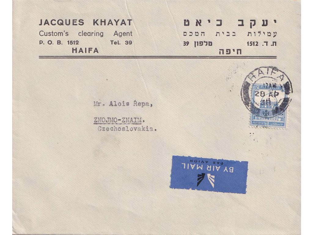 Poštovní celistvost, Palestina, 1938, DR Haifa, let. dopis zasl. do ČSR, stopy pošt. provozu