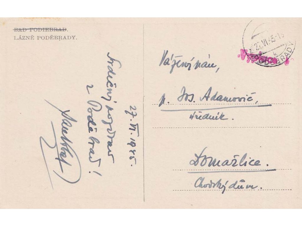 Provizorní razítka, Poděbrady, pohlednice zasl. v roce 1945 do Domažlic, doplatné
