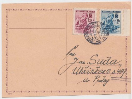 1942, DR Praha, dopisnice přelepená sérií zn. 60h-1.20K Červený kříž