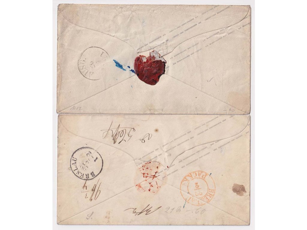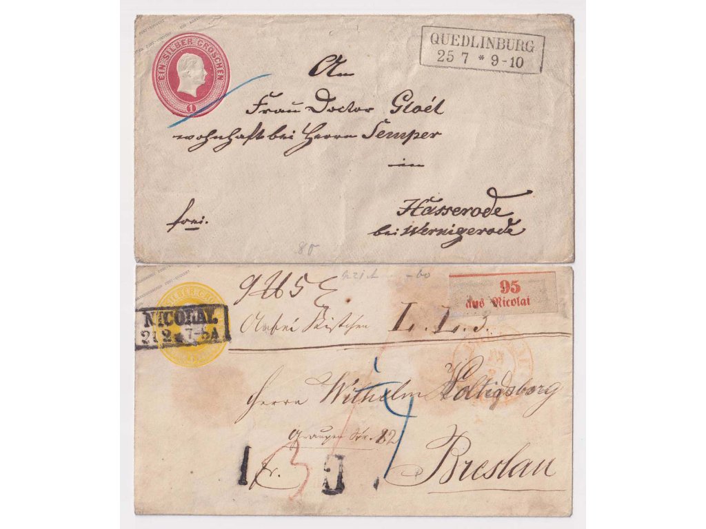 Celinové obálky, Prusko, 2 ks celinových obálek 1 a 3 SGr, obě prošlé, 1krát rekomando, razítka Nicolay a Quedlinburg, prošlé cca 1870, horší jakost - viz. foto