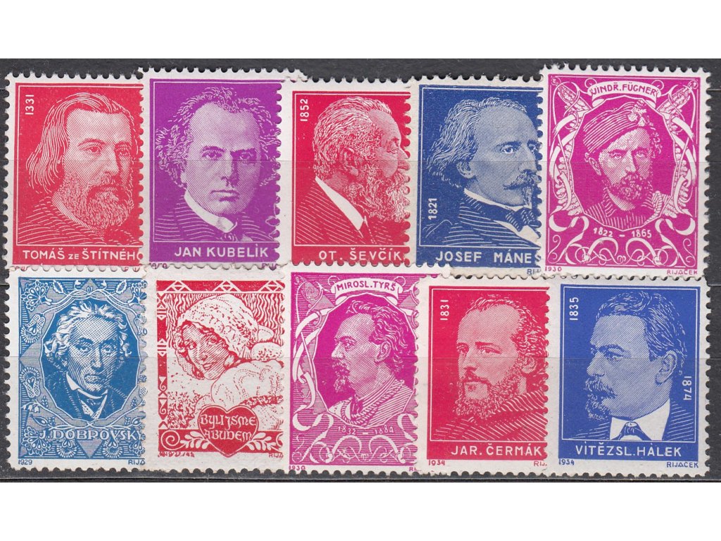 Rijáček, 10 ks návrhů (zálepek) čs. zn. významných osobností, každá jiná, 1930-1940