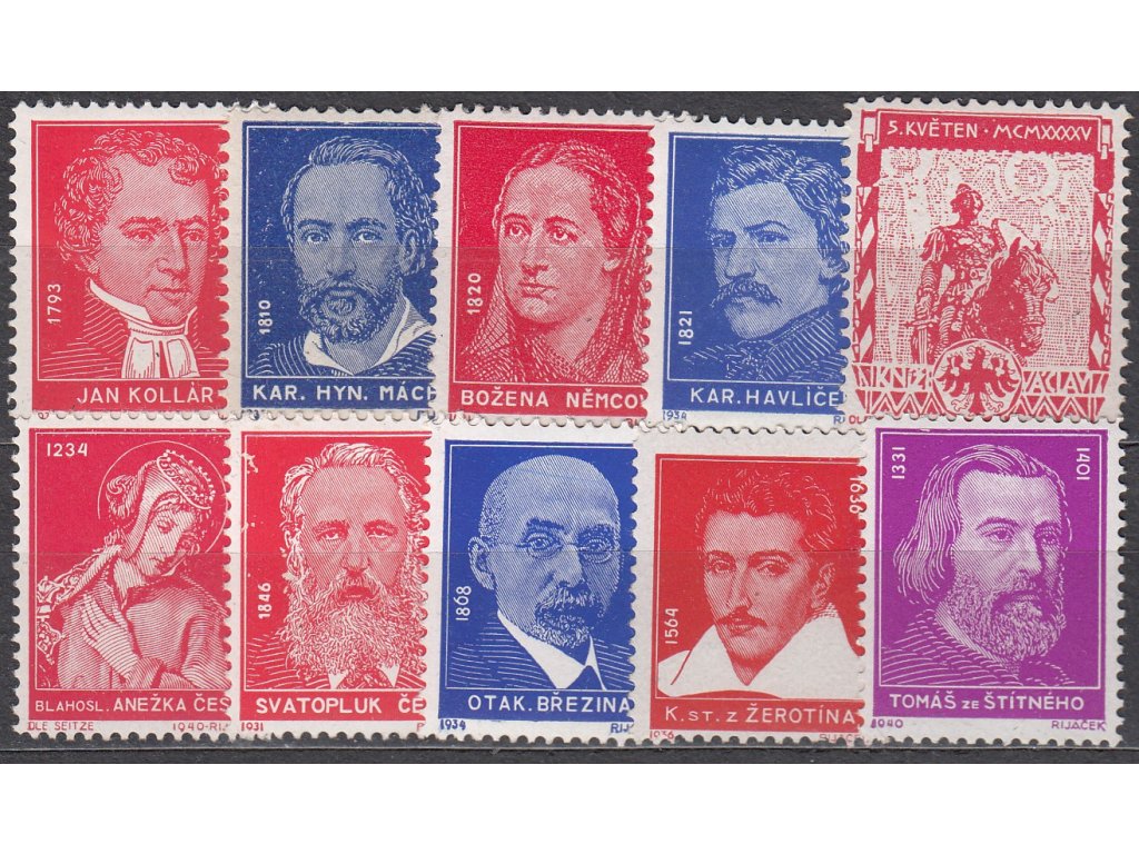 Rijáček, 10 ks návrhů (zálepek) čs. zn. významných osobností, každá jiná, 1931-1945