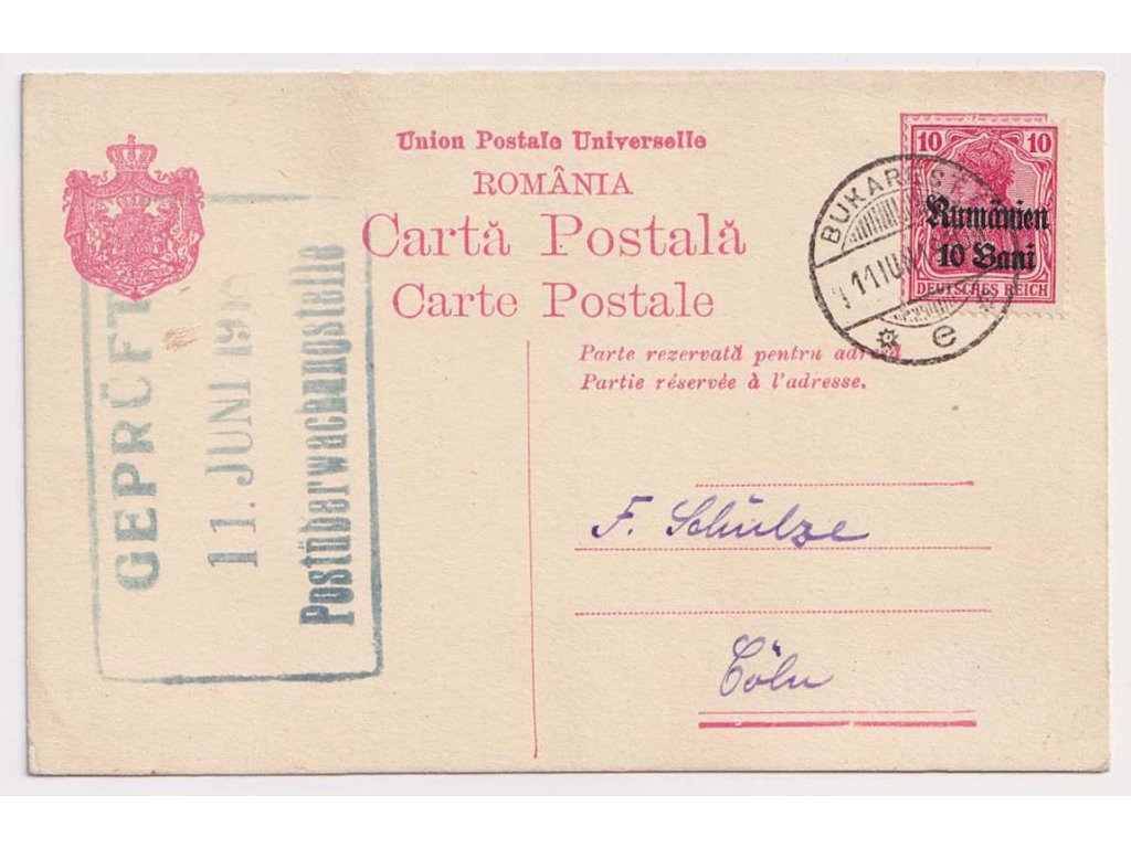 Poštovní dopisnice, Rumunsko, rumunská dopisnice přelepená zn. 10Bani/10Pf Germanie, DR Bukarest, prošlé v roce 1918, fil. korespondence, bez textu, ohnutý růžek - viz. foto