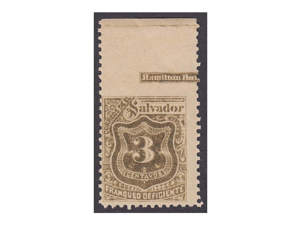 Poštovní známka, Salvádor, 1895, 3 C doplatní, MiNr.3, * po nálepce, chybějící perforace