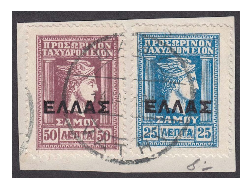 Poštovní známka, Samos, 1912, 25 a 50 L Hermes s přetiskem, MiNr.12,13, výstřižek DR Bagy Vathy