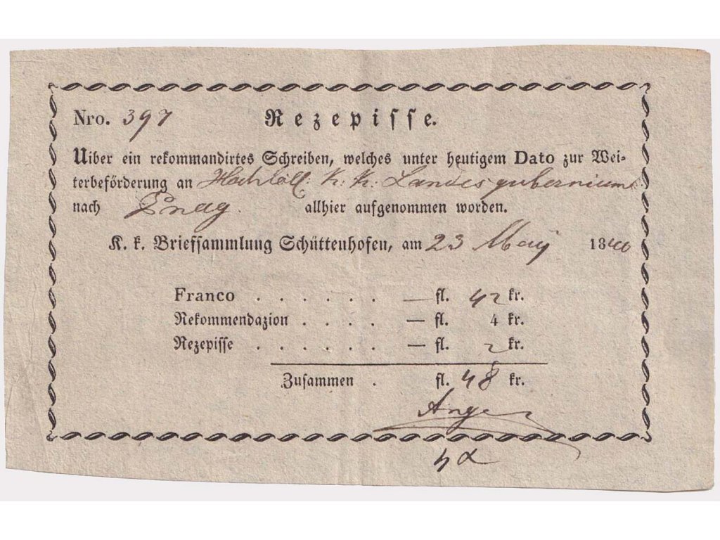 Podací lístek, Schüttenhofen, recepis z roku 1846, přeloženo, slušný kus