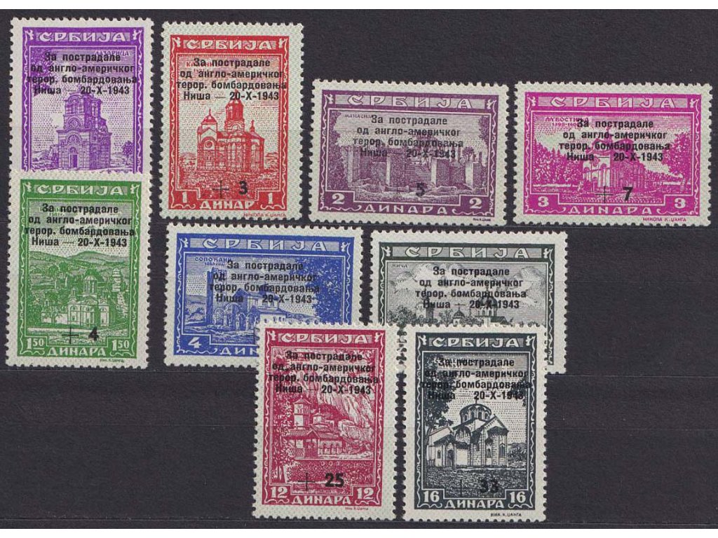 Poštovní známka, Serbien, 1943, 0.50-16 Din série Kláštery s přetiskem, MiNr.99-107, **/*