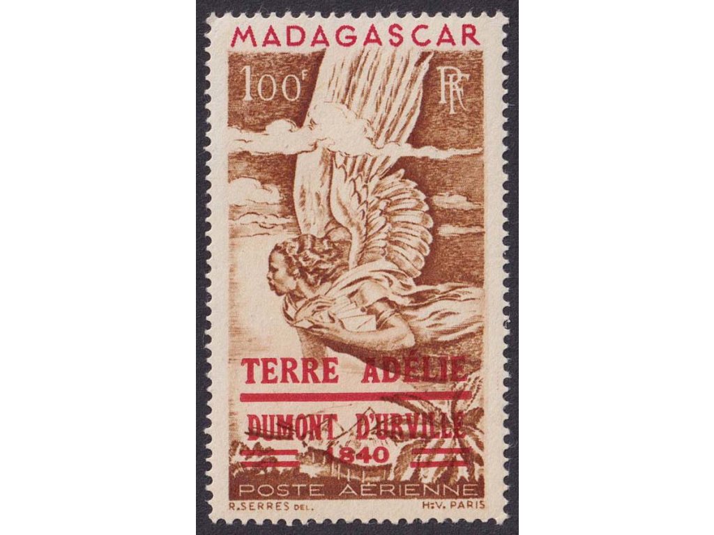 Poštovní známka, Terre Adelie, 1948, 100 Fr letecká, přetisk na známce Madagaskaru, MiNr.417, **