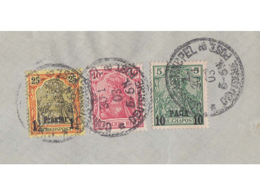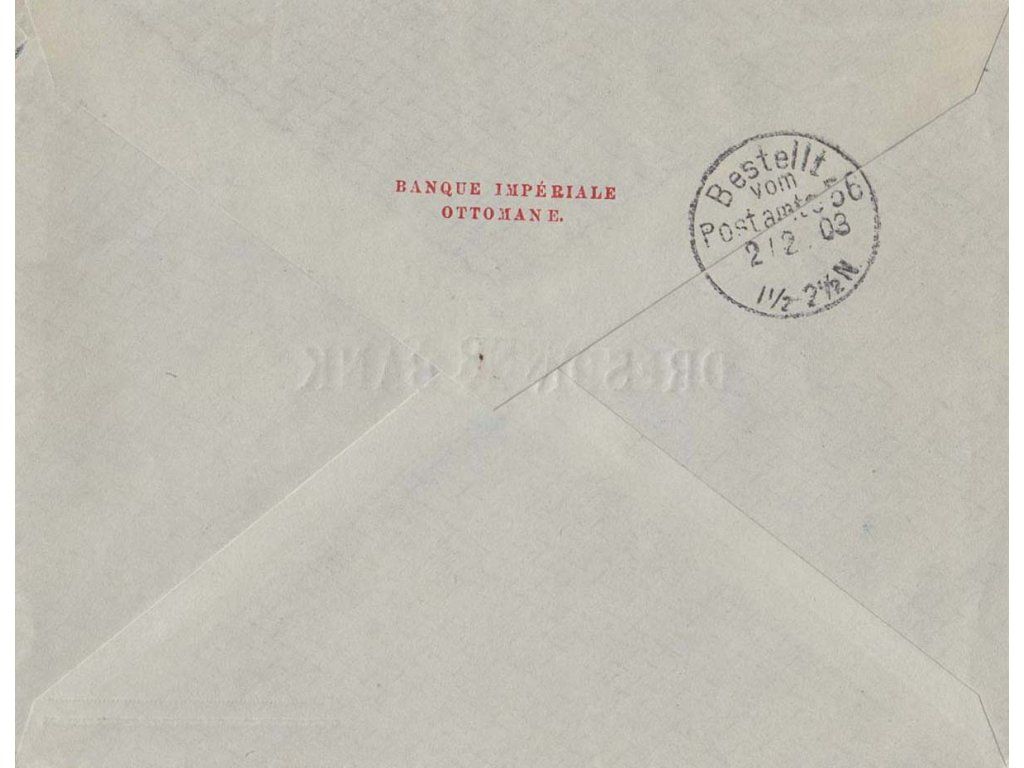 Poštovní dopis, Turecko, 1903, razítko Constantinopel, obálka vyfrankována známkami Germanie, část s perfinem B I O (Banque Imperiale Ottomane), zasláno na Dresden Bank v Berlíně, slušný kus - viz. foto, stopy pošt.provozu