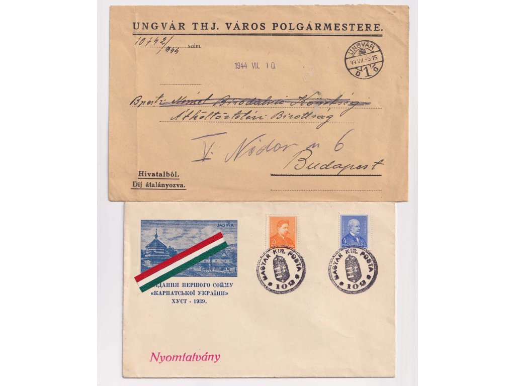 Maďarský zábor, Ungvár + Magyar Kir. Posta 102, 2 ks celistvostí, 1krát prošlé v roce 1944, kvalita - viz. foto