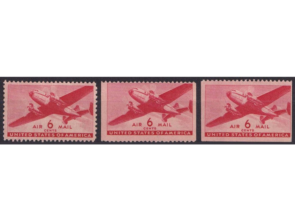 Poštovní známka, USA, 1941, 6 C letecká, varianty zoubkování, MiNr.500A,D,E, **/*
