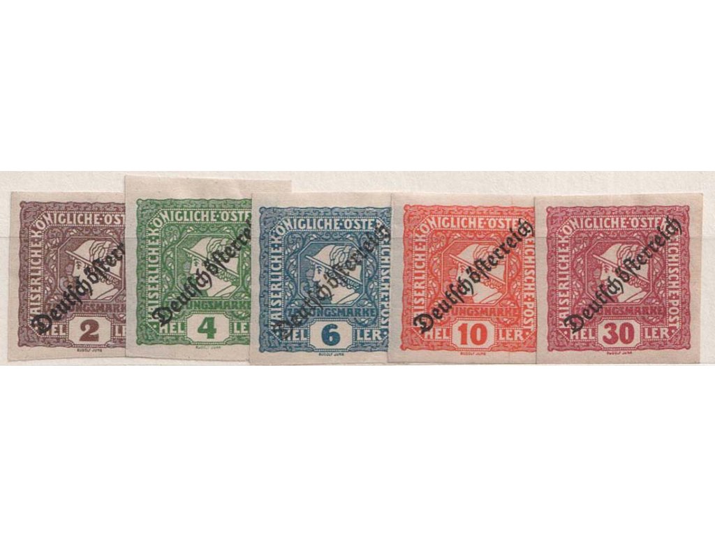 Poštovní známka, 2-30H novinová série s přetiskem Deutschösterreich, tyto známky platily v omezené míře na území ČSR (Valticko a Vítorazsko) až do roku 1920, MiNr.247-51, * po nálepce