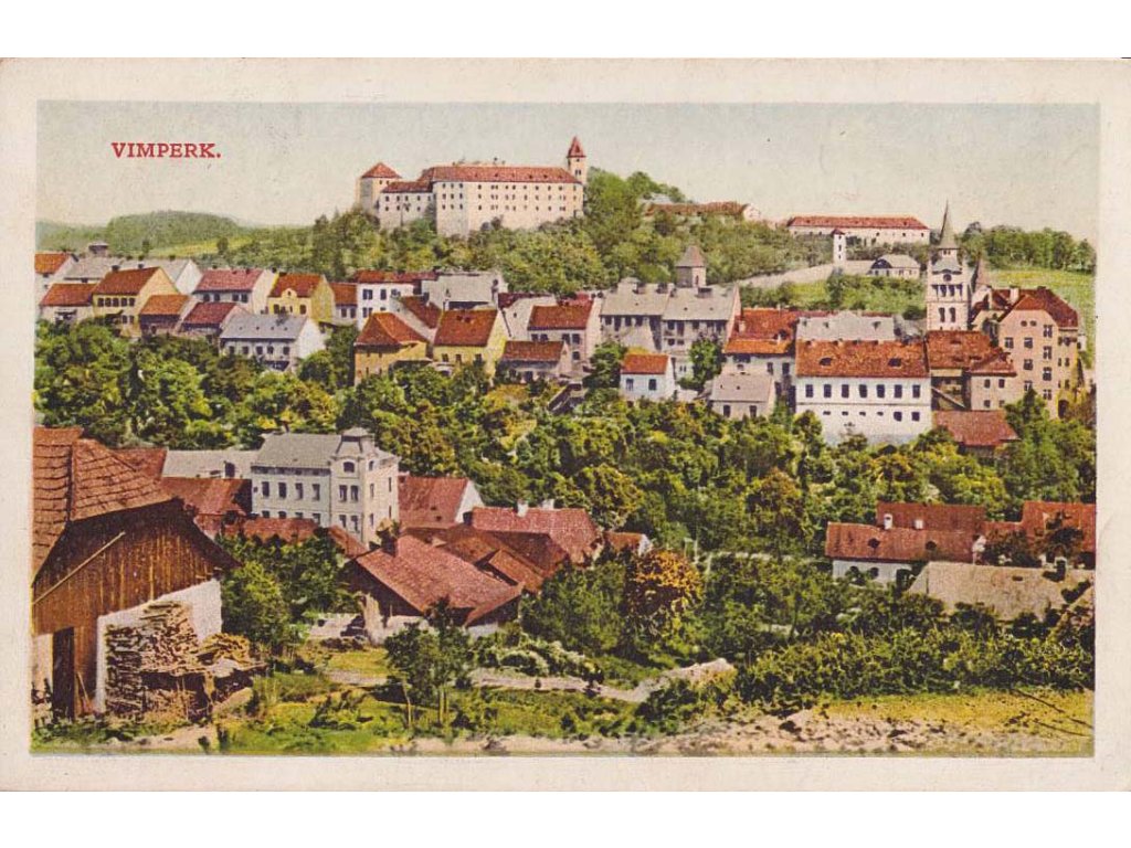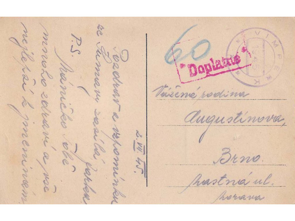 Vimperk, 1945, pohlednice zasl. do Brna, zde zatížena dopl. známkou