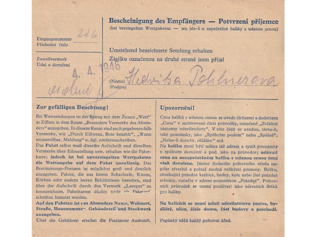 Provizorní razítko, Vlčice ve Slezsku, větší díl poštovní průvodky zasl. v roce 1946 do Frývaldova