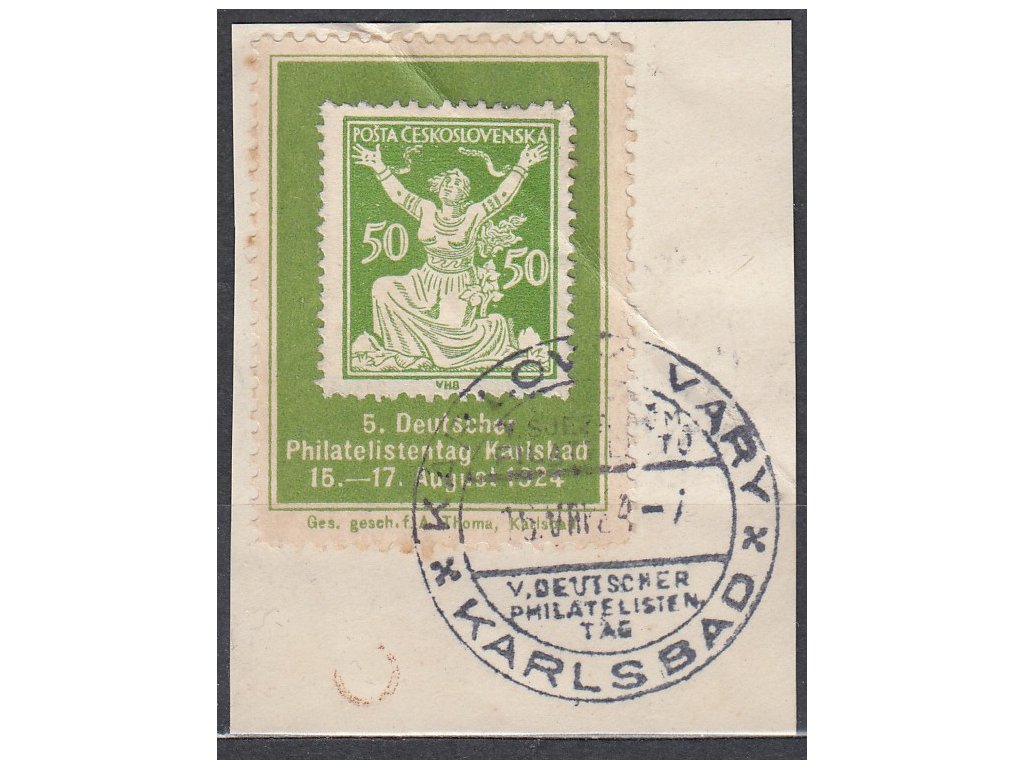Výstřižek vyfr. nálepkou výstavy KARLSBAD se zn. 50h, prošlé 1924