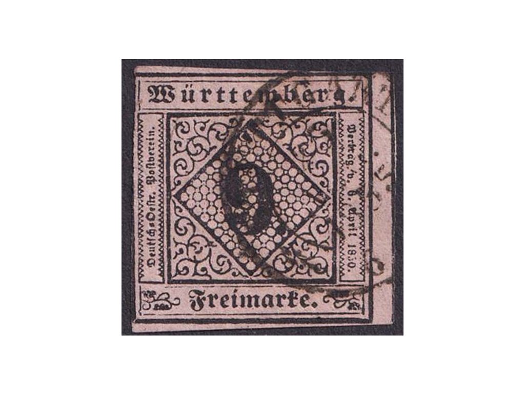 Württemberg, 1851, 9 Kr černá/růžová, MiNr.4, razítkované