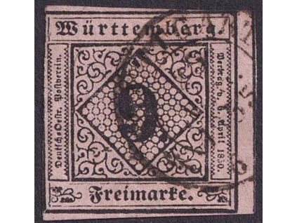 Württemberg, 1851, 9 Kr černá/růžová, MiNr.4, razítkované